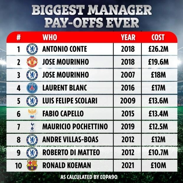 日前,巴薩官方宣布解僱荷蘭主帥科曼後,英國《太陽報》就此盤點了足壇主帥遣散費排行,孔蒂以2620萬英鎊位居首位,曾擔任切爾西和曼聯主教練的穆里尼奧位居第二和第三位,而科曼則以1000萬鎊位列第十。