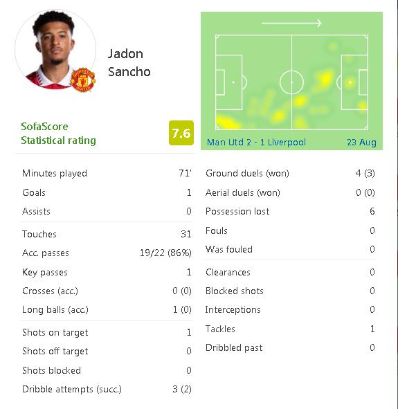 比賽熱圖顯示,桑喬主要在球場左側活動,在前場和後場都有他的身影。