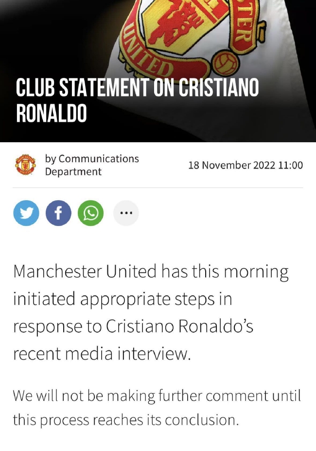 曼聯官方寫道:“今天上午,曼聯針對C朗最近的媒體採訪採取了適當的措施。”
