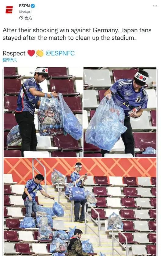 ESPN也曬出了日本球迷收拾垃圾的照片,並表示:尊重。也有球迷表示:這就是素質。