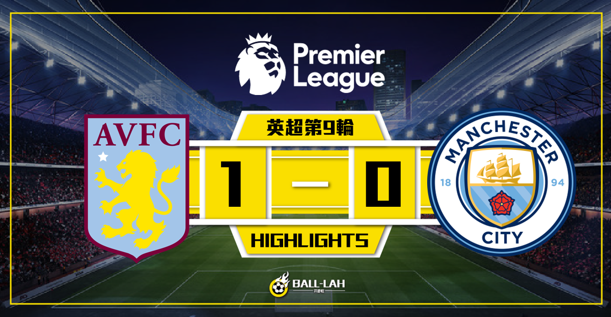 【維拉1-0擊敗曼城 夏蘭特連續12場入球被終結】