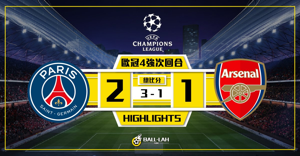 【巴黎2-1擊敗阿仙奴 總比分3-1淘汰阿仙奴】